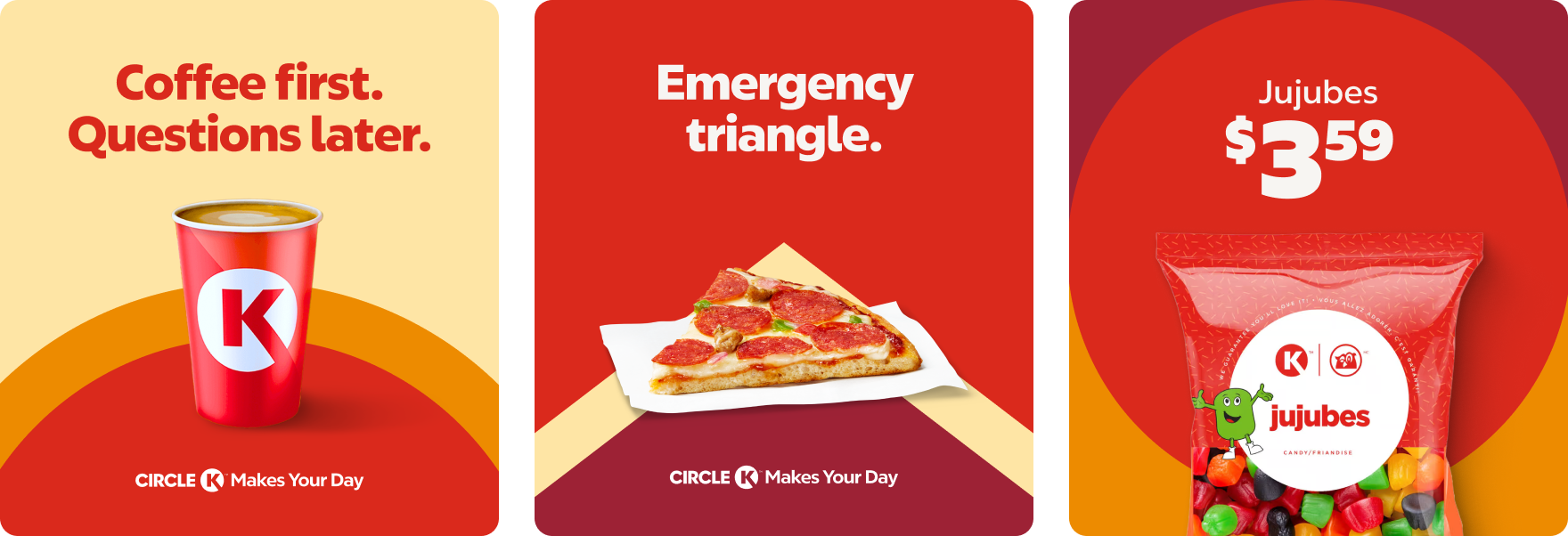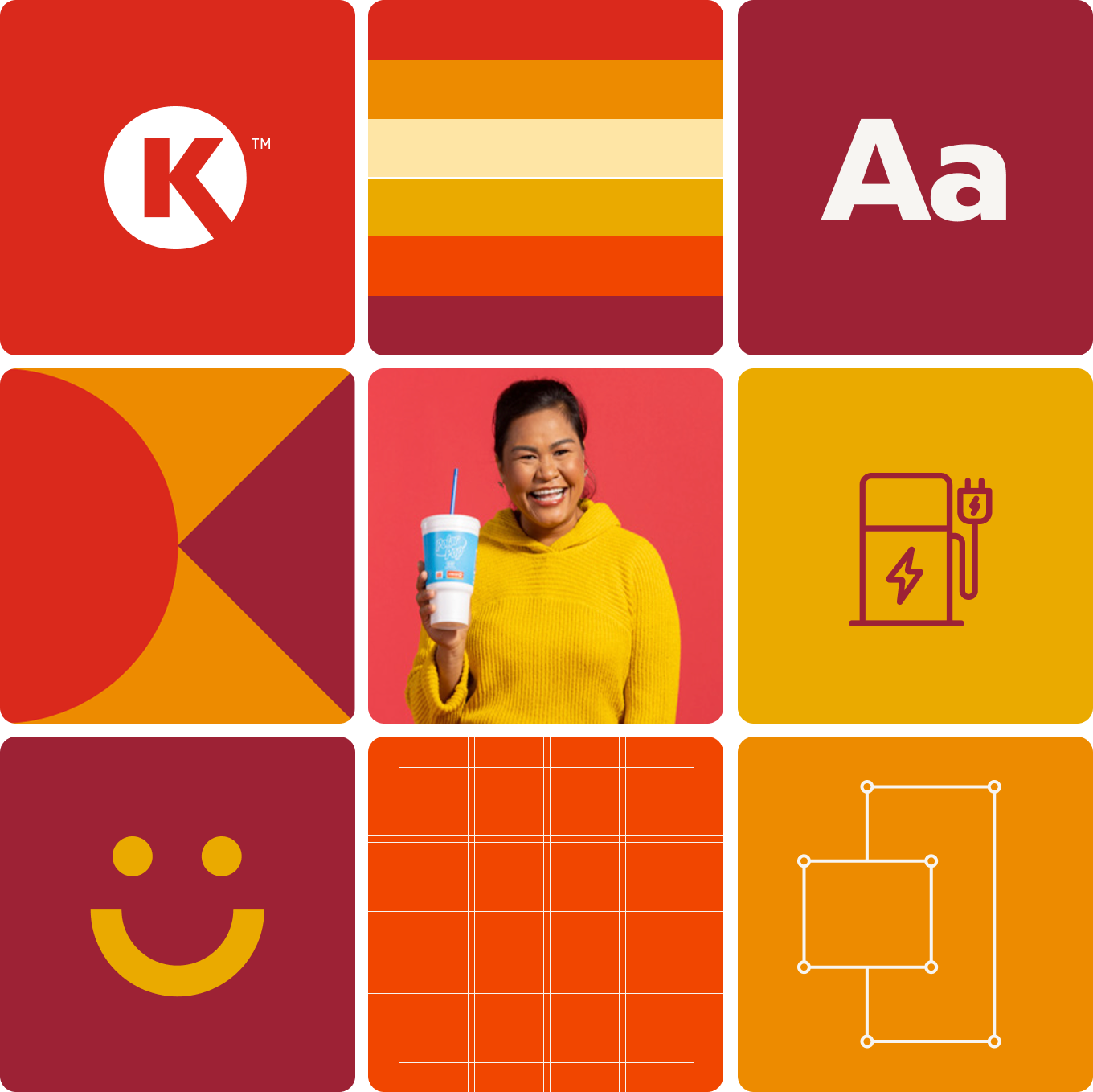 Color does the heavy lifting. Circle K red and orange remain the core of the identity, bold, warm, and instantly recognizable. Supporting yellows, mustards, and darker tones add flexibility without diluting impact.
