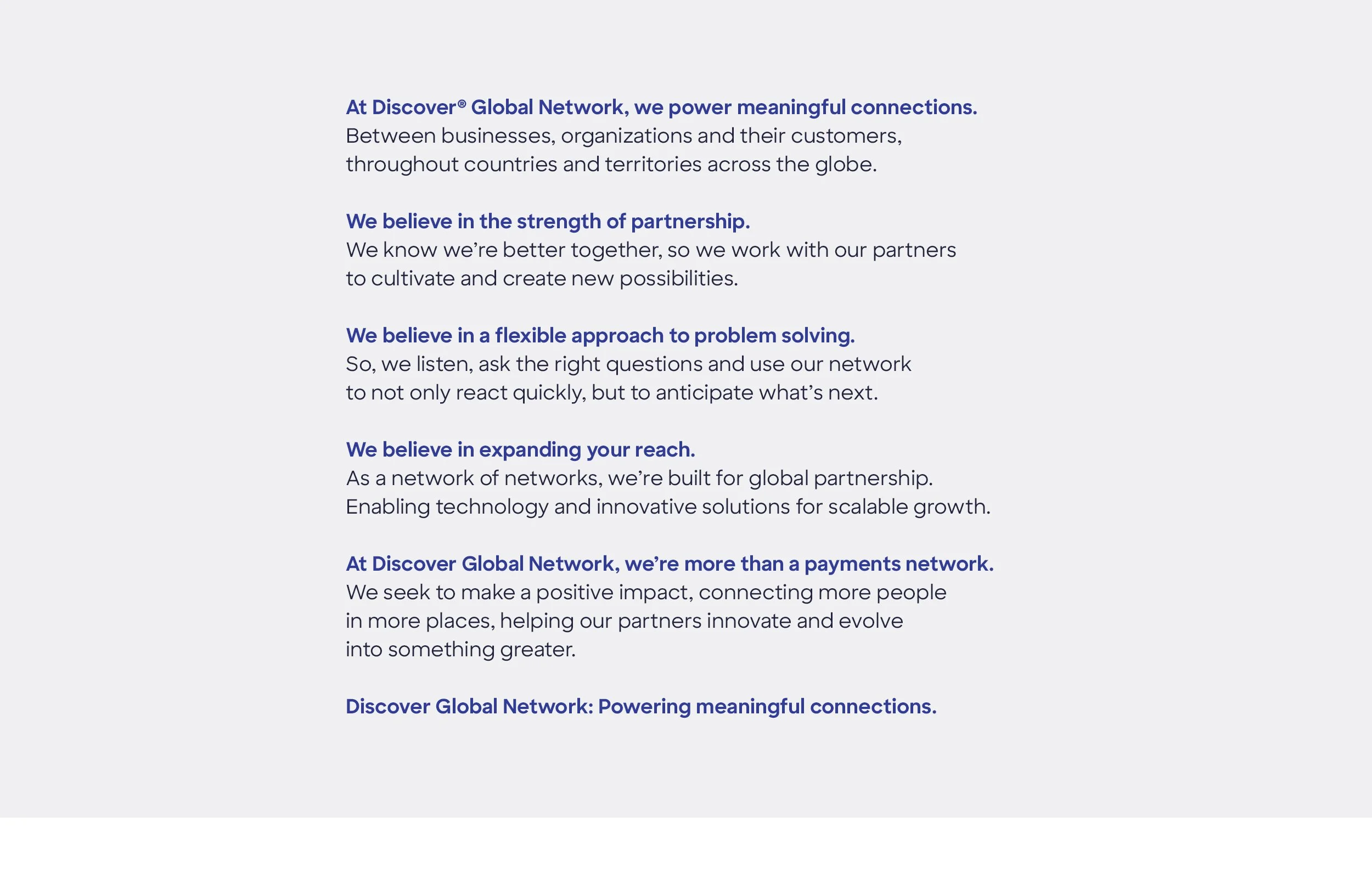 We crafted a manifesto that perfectly illustrates both the technicality and the humanity in how Discover Global Network serves its partners while powering meaningful connections.
