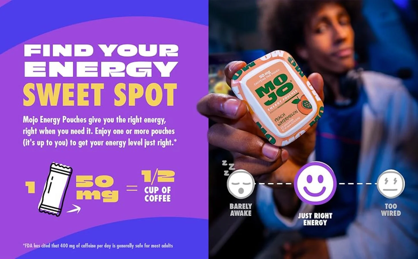 We rebuilt the brand strategically and creatively to reintroduce Mojo as a new, customizable take on energy: 50 mg caffeine pouches without the high-highs or low-lows of other energy solutions. A new brand framework, redesigned website, and full suite of launch creative let people know when you need to get your energy right, you need Mojo….energy by the pouch.