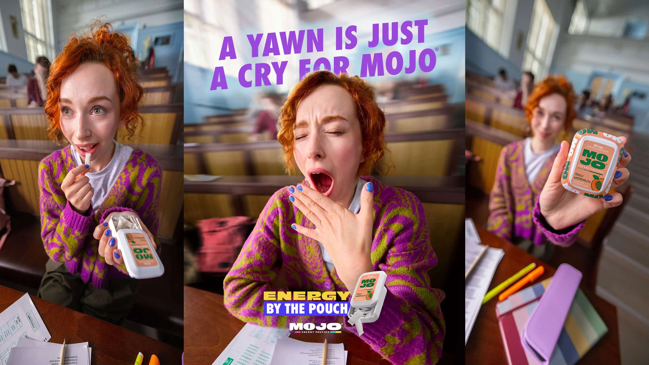 Mojo® Energy Pouches are a new take on energy—50 mg caffeine pouches made to give people the boost of energy they need, without the jitters or crashes that come with other energy products. And because we’re a different kind of product, we took a different approach to our launch films. No one was flying around or yelling about how they have SO. MUCH. ENERGY!!! We had people do what every single one of us does when we’re tired…yawn. And turned that yawn into a bat signal for the just-right energy of Mojo to show up and save the day.